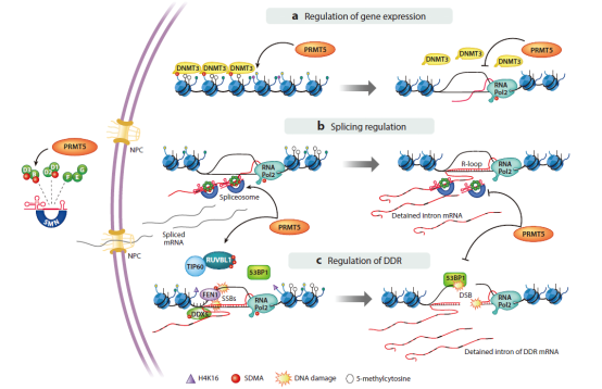 PRMT5通过对称二甲基化,翻译后修饰组蛋白和其他蛋白质;这种由PRMT5催化的蛋白质底物甲基化在调节关键细胞进程中起着重要作用,如DNA修复、细胞周期进展、转录调控和RNA剪接等。PRMT5被认为是一种潜在的致癌基因。