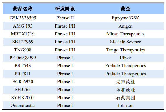 2016年,发表在《Science》的文章首次报道了抑制PRMT5在MTAP(甲硫腺苷磷酸化酶)缺失肿瘤中的“合成致死”效应,文章指出与PRMT5构成合成致死的基因是MTAP,这是一种抑癌基因,常在肿瘤中发生缺失。因此,PRMT5/MTAP抑制剂被认为是潜在的抗肿瘤药物。目前,大约有十几款PRMT5抑制剂已进入临床阶段。