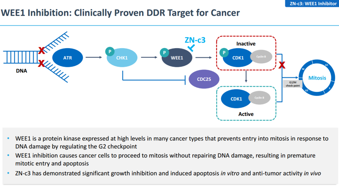 在全球Wee1抑制剂研发进展中,Zentalis的ZN-c3进展最快。ZN-c3由Zentails公司开发,是一款治疗晚期实体瘤的Wee1口服抑制剂。它能使癌细胞在不修复DNA损伤的情况下进行有丝分裂,导致有丝分裂提前进行,造成癌细胞凋亡。