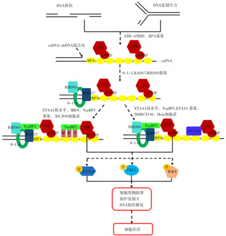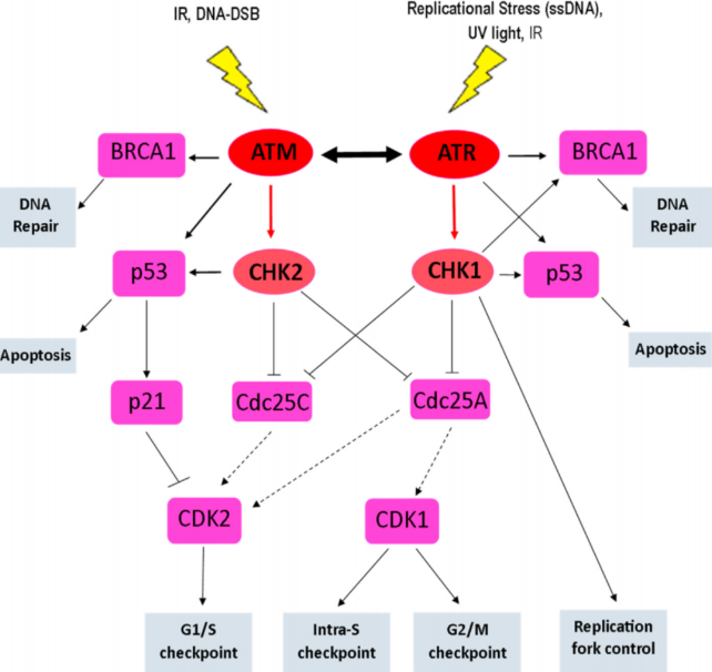 ATR全称共济失调毛细血管扩张突变基因Rad3相关激酶,是一种在DNA损伤后能够激活细胞应答,进而阻滞细胞周期进程并稳定复制叉及修复DNA,从而回避细胞凋亡的重要激酶。当细胞内DNA复制压力、DNA损伤产生时,ATR被募集至DNA损伤部位,多种蛋白参与调控ATR的激活。当ATR激活后,可通过多种信号调控细胞生物过程,包括细胞周期阻滞、抑制复制起点、启动复制叉以及修复DNA双链断裂等。