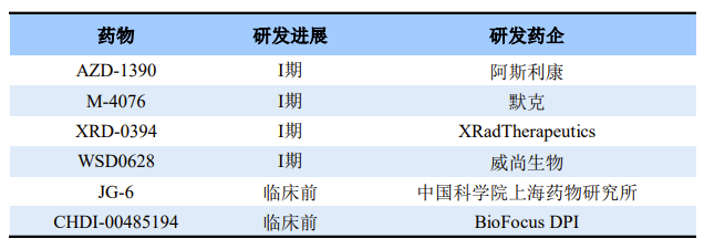 ATM磷酸化后,会相继调控其他激酶活性,如细胞周期检测点激酶2(CHK2);另P53曾经被用作ATM活化的标记物,其作用机制也被广泛研究。目前ATM抑制剂均处于临床早期阶段,仅有4款处于临床I期,分别是:阿斯利康的AZD-1390、默克的M-4076、XRadTherapeutics的XRD-0394,威尚生物的WSD0628。