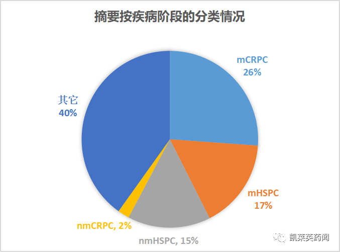 按照疾病阶段来看:转移性去势抵抗性前列腺癌(mCRPC)、转移性激素敏感性前列腺癌(mHSPC)、非转移性激素敏感性前列腺癌(nmHSPC)为热点方向,数量分别是86、54、50篇;非转移性去势抵抗性前列腺癌(nmCRPC)的摘要相对较少,数量为7篇。
