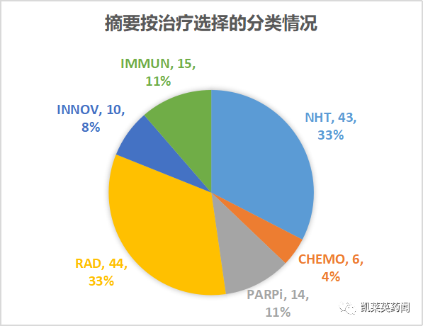 从治疗选择看:2/3的摘要集中在新型内分泌及放疗疗法,其次是免疫治疗、PARP抑制剂、创新疗法。