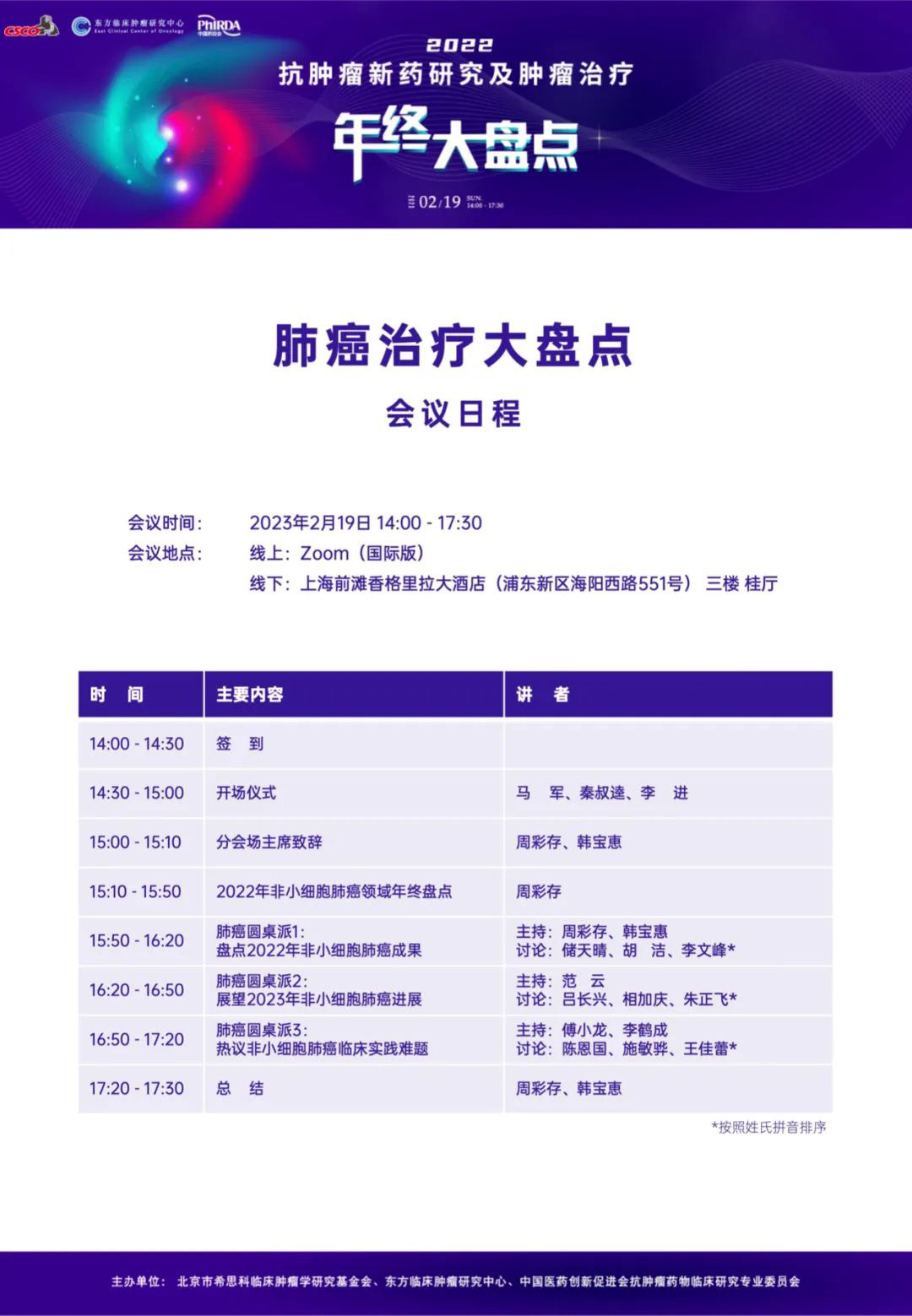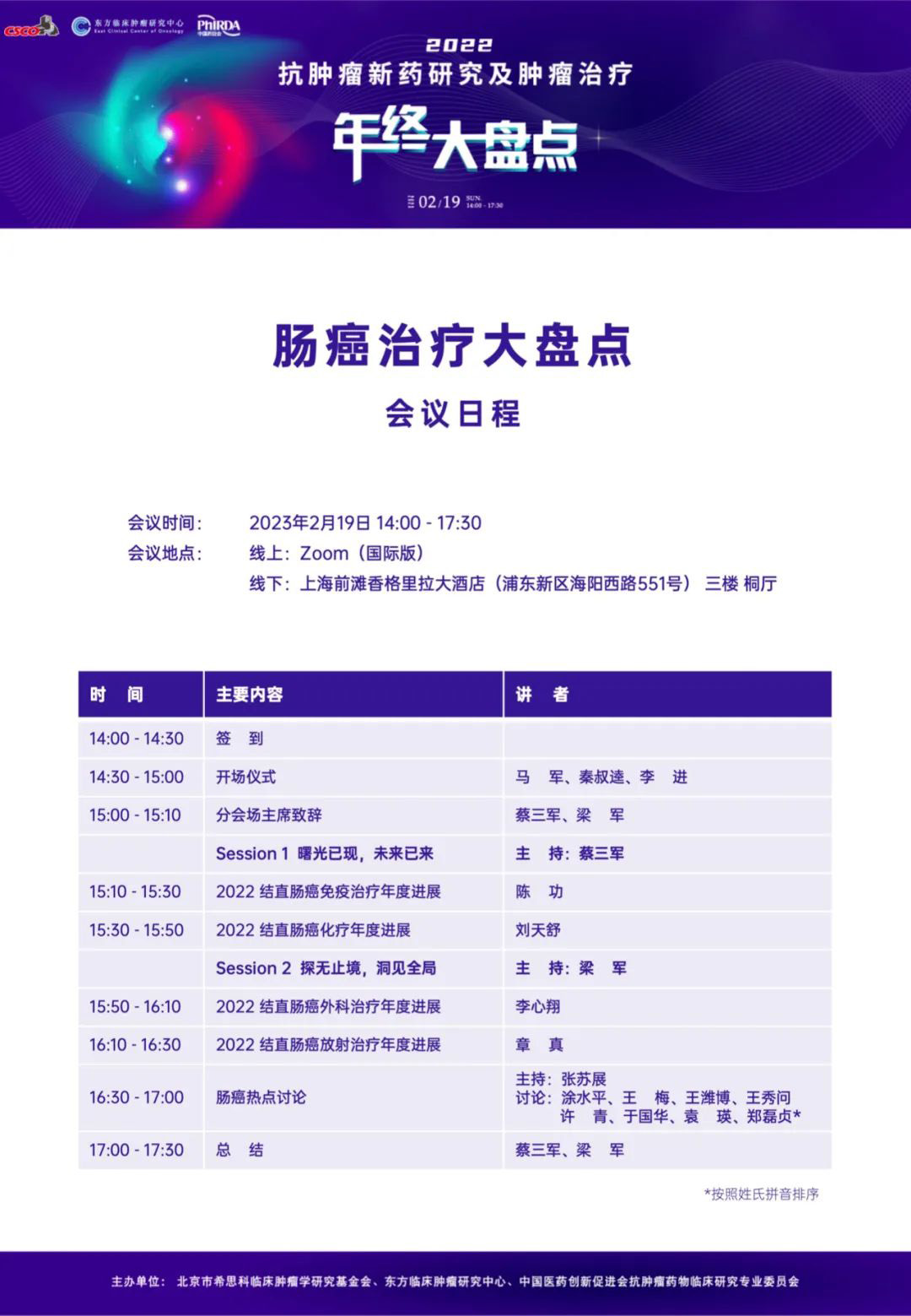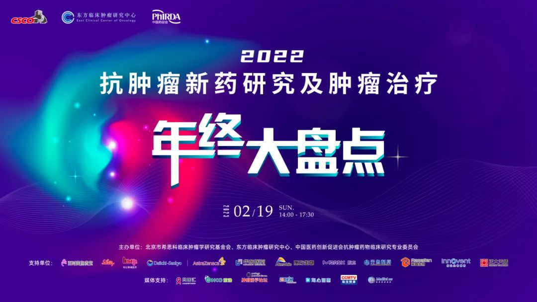 大家好!由北京市希思科临床肿瘤学研究基金会、杭州东方临床肿瘤研究中心(ECCO)与中国医药创新促进会抗肿瘤药物临床研究专业委员会共同主办的“2022 抗肿瘤新药研究及肿瘤治疗年终大盘点”将于2023年2月19日线上线下同步召开。