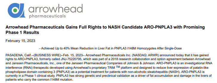 2月15日,Arrowhead Pharmaceuticals宣布,重新获得ARO-PNPLA3(以前称为JNJ-75220795)全部权利。Arrowhead表示,强生在战略研发组合审查之后,决定将ARO-PNPLA3全部权利交还给Arrowhead。