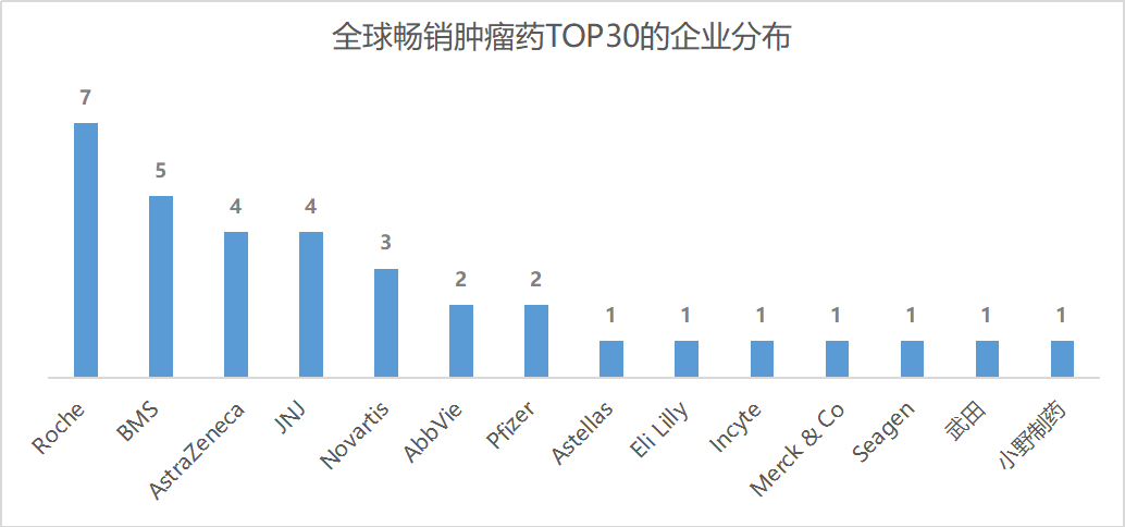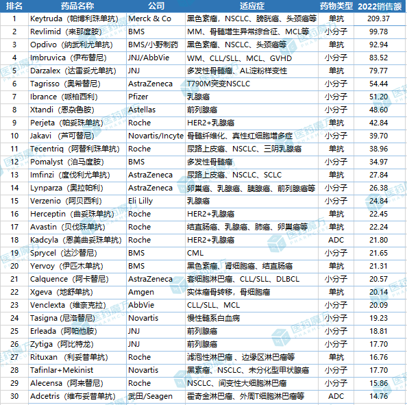 2022全球肿瘤药销售额TOP30(亿美元)