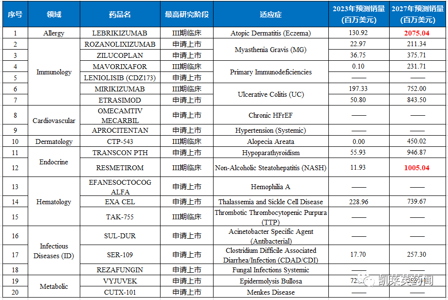 在本篇文章中,我们对Allergy(过敏反应)、Immunology(自身免疫)、Cardiovascular(心血管)、Dermatology(皮肤)、Endocrine(内分泌)、Hematology(血液学)、Infectious Diseases(传染病)、Metabolic(代谢)领域的潜力上市药物进行汇总。预测2027年,销量有望突破10亿美元的重磅品种依次是:用于治疗特应性皮炎的抗IL-13单抗Lebrikizumab和用于治疗NASH的甲状腺激素受体β激动剂Resmetirom。