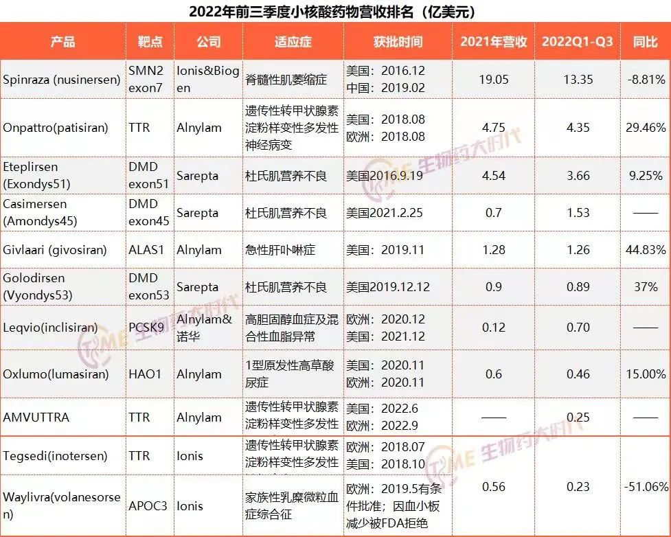 从全球第一个小核酸药物2016年获批以来,7年的时间里获批了11款新药,该领域也出现了超过10亿美元级别的药物 —— 诺西那生钠注射液(Ionis和Biogen合作研发),用于治疗脊髓性肌肉萎缩。同时,大多数已上市品种在2022前三季度出现正向的销售增长,一片欣欣向荣的景象。