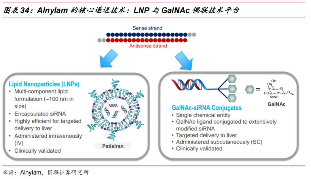 现有的全球小核酸药物龙头正是在递送技术上具备独特的领先优势,才能够占得先机。例如:Alnylam开发出了基于MC3脂质分子的LNP技术平台、肝脏递送的 GalNAc偶联技术等突破性的siRNA递送技术等。