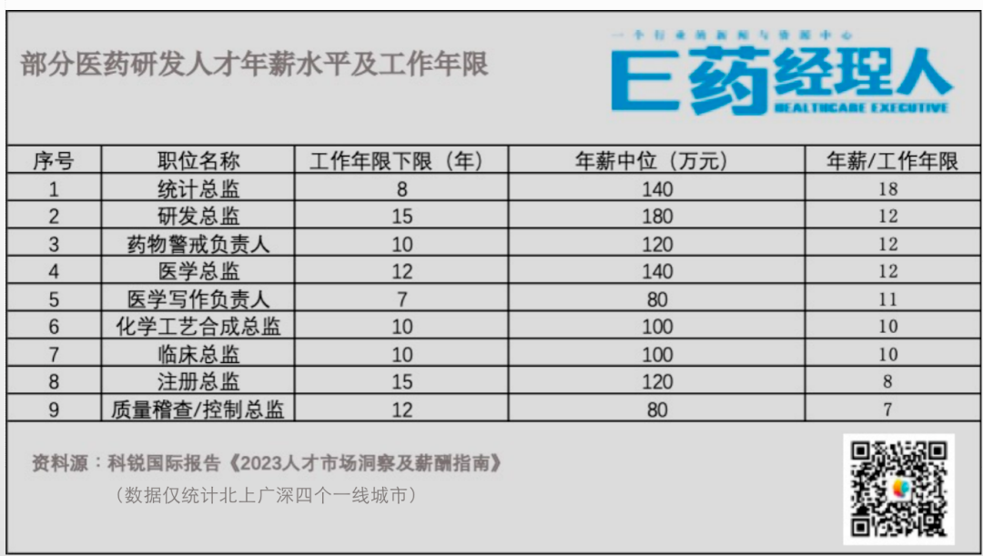 而临床总监和人员管理经理已经进入相对饱和的阶段,同为总监级别,临床总监的年薪为120~180万元,而注册总监年薪最高为200万元,相当于A股上市药企科伦药业董事长刘革新、华东医药董事长吕梁两位各自2022年的薪酬。