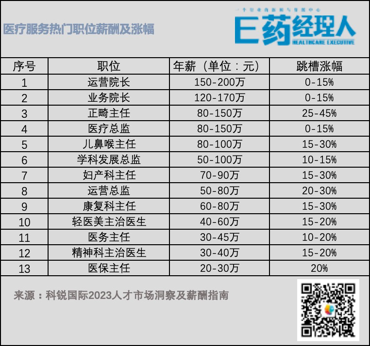 医疗服务整个行业中,热门岗位还包括康复科主任、妇产科主任、耳鼻喉主任、轻医美主治医生、正畸主任等,其中正畸主任年薪在80-150万元,跳槽涨幅高达25-45%。康复师、特定科医生岗位较为稀缺,其薪酬具有较大的竞争力,涨幅可达15-30%。