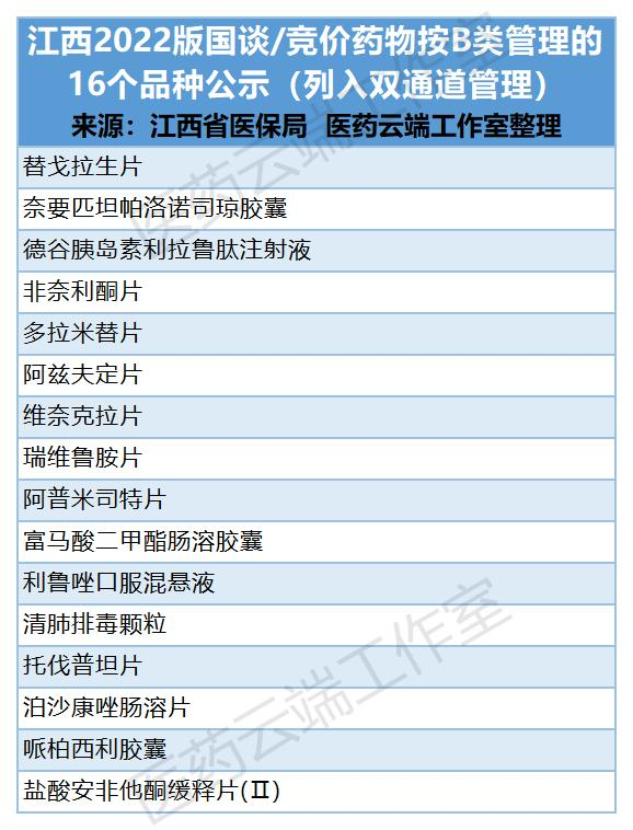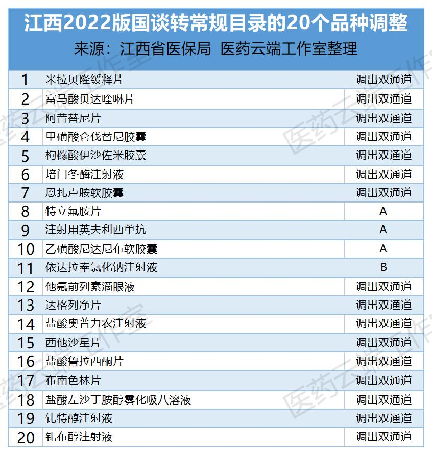 2022版目录转为常规目录的20个品种:16个退出江西双通道管理,4个保留双通道管理政策
