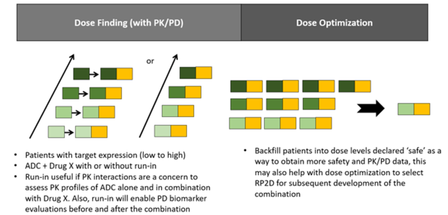 评估ADC联合的临床试验设计的基本原则与国家癌症研究所研究药物指导委员会的临床试验设计工作组发表的原则是一致的。要在临床试验之前提供一个可靠的假设来证明为什么特定的药物应该被联合使用,这种联合的预期结果和预计的发展计划需要提供给临床试验。如果担心重叠的剂量限制毒性,或PK的合理机制基础,或导致临床相关不良事件的药效学相互作用,对ADC与另一种药物进行正式的I期联合评估是适合的。I期联合研究中基于剂量递增设计将允许根据观察到的毒性和药物相互作用对不同剂量进行适应性探索。如果一种药物的剂量递增计划与其联合药物的固定剂量一起进行,并且药物相互作用是可能的,那么建议采用一种设计,将最初在第一个周期中的一个药物作为单一疗法进行序贯评估,然后在随后的周期中进行联合治疗。这一设计能够评估PK和药效相互作用,可以在每个参与者内部进行比较,并与历史数据进行比较。如果没有预期的药物相互作用,那么联合的剂量递增可以直接进行开展。选择具有最佳治疗指数的组合剂量的剂量优化可以通过利用回填策略在剂量递增期间同时进行,以提供进一步的安全性、PK和药效学数据(图3)。使用随机方法评估两个或更多剂量水平后,剂量优化也可以作为一个单独的组成部分在完成剂量递增后发生。