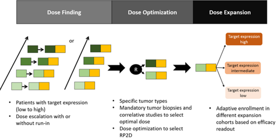 最后,基于ADC的联合用药的剂量扩展队列可以根据靶点表达的情况进行分级。这可以评估ADC的联合用药对不同靶标表达水平的抗肿瘤活性。应根据观察到的疗效考虑适应性登记,以增加参与者获得治疗益处的机会(图4)。