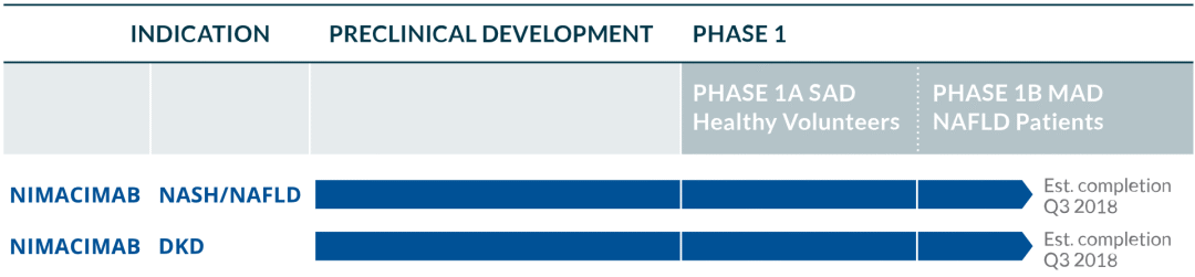 Bird Rock的官网上,Namacizumab进行中的研究包括两项。其中,NASH适应症的多次给药剂量递增Ib期临床于2018年第三季度完成。而虽然强生获得了该资产,却没有进行更多的消息披露。
