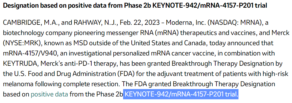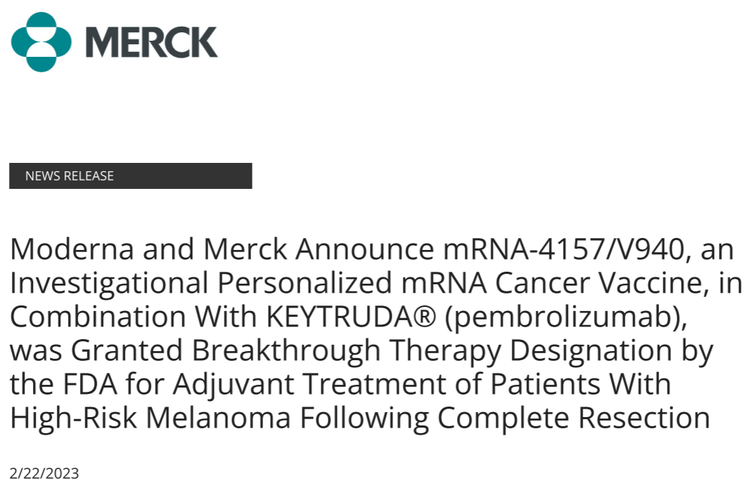 2023年2月22日,Moderna与默沙东宣布,肿瘤新抗原mRNA疫苗mRNA-4157/V940+PD-1抗体联合辅助治疗高危黑色素瘤防止术后复发,获得FDA的突破疗法认证。