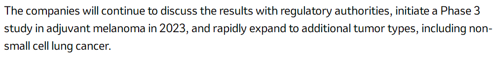 Moderna与默沙东计划今年启动三期临床,并快速扩展至其他瘤种,包括非小细胞肺癌。