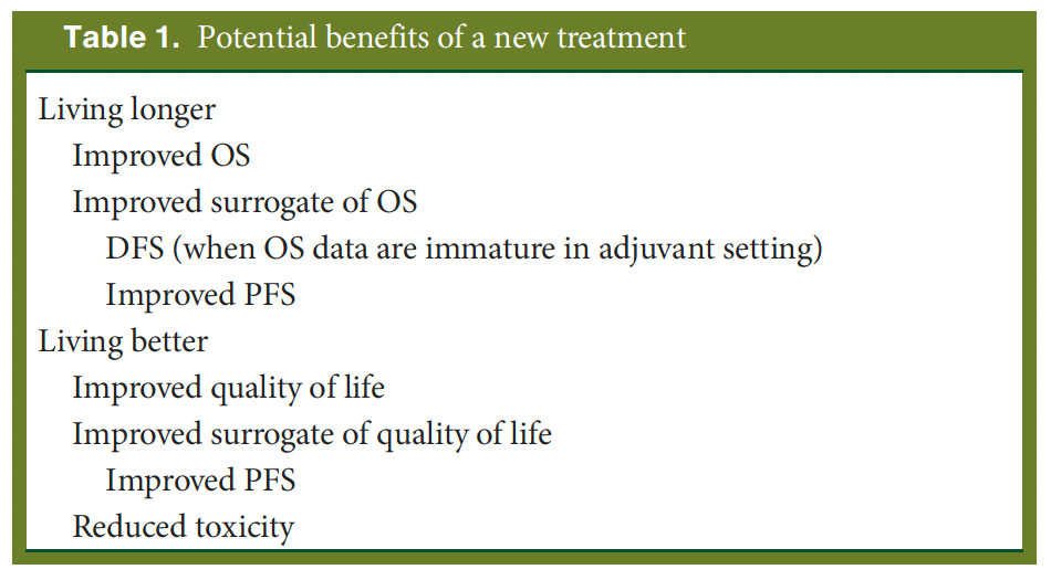 新的肿瘤治疗方案的获益可以概括为:“活得更长”和/或“活得更好”。临床试验中,通过总生存期(OS)和/或生存质量(QoL),及其替代指标进行评估。