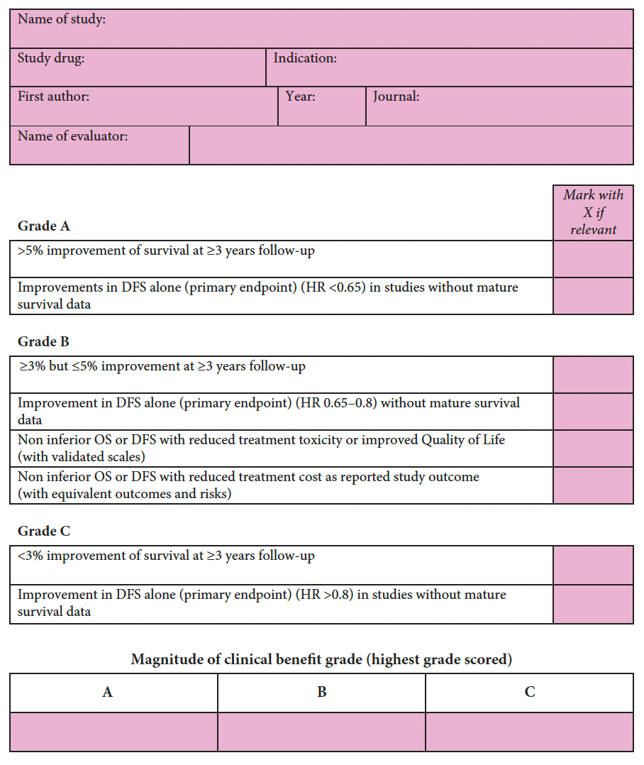 ESMO-MCBS的初稿由276名ESMO成员和51名生物统计学家组成的团队起草,经过反复的修改和讨论,最终由指定的ESMO成员以及ESMO委员会共同审查。ESMO-MCBS(v1.0)只能用于实体瘤治疗的评估,分为两组表格。