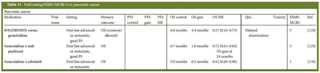来看一些具体的例子。乳腺癌中,曲妥珠单抗的HERA研究(辅助化疗后,接受1年的曲妥珠单抗治疗,2年的DFS率为77.4%,PFS HR=0.54),评估结果为A级。晚期胰腺癌中,与吉西他滨相比,吉西他滨联合厄洛替尼能取得0.3个月的OS获益(6.2个月 vs 5.9个月,P=0.038,HR=0.82),虽然这是一个阳性结果,根据ESMO-MCBS仅为1级。而FOLFIRINOX(奥沙利铂,伊立替康,氟尿嘧啶,亚叶酸钙)与吉西他滨的对照结果显示,前者能取得4.4个月的OS获益(HR=0.57),评估结果为5级。