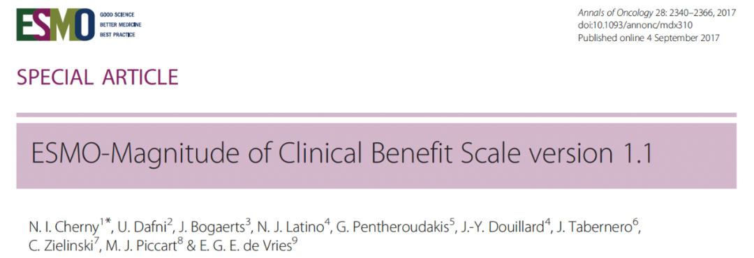 2017年,ESMO对ESMO-MCBS(v1.0)进行了修订,更新后为ESMO-MCBS(v1.1)版。经过修订后,除了可以对单臂研究进行评估以外,还针对“亚组分析的说明”,“以病理完全缓解(pCR)作为终点的辅助治疗”,“生存曲线长期处于平台期”,“较长中位OS的研究”,“交叉问题”等10项内容进行了修订。