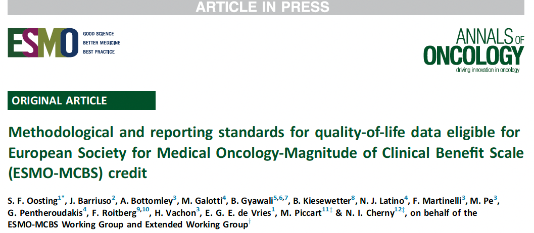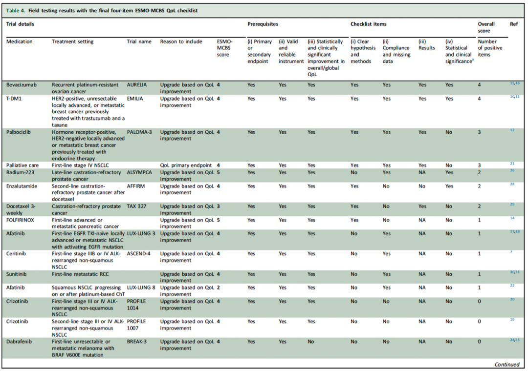 近年来,肿瘤患者的生活质量越来越受到重视,尤其是在不以治愈为目标的情况下。2022年12月,学会工作组在原先ESMO-MCBS的基础上进一步增加了生活质量评估清单。如果与对照组相比,生活质量改善,ESMO-MCBS评级将会升级;如果PFS的改善与生活质量或OS的改善不同步,则ESMO-MCBS评级将会降级。考虑到生活质量对最终评级的重要性,需要确保临床研究中生活质量数据的稳健性。