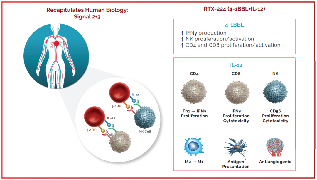 RTX-224,通过基因工程改造,让红细胞表达 4-1BBL 和 IL-12,通过激活 4-1BB 和 IL-12 信号通路,刺激 CD4+T 细胞、CD8+T 细胞,NK 细胞和抗原呈递细胞(APC),以产生抗肿瘤免疫反应。目前正处于1/2期临床试验中。RTX-224 已经给予了8名实体瘤患者。