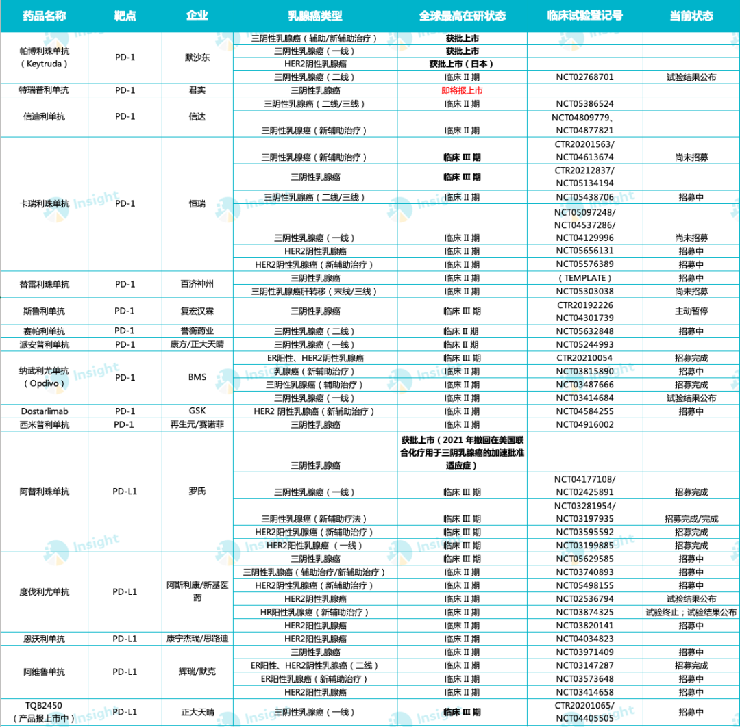近年,以 PD-(L)1 抑制剂为代表的肿瘤免疫治疗药物在多个瘤种当中取得了一系列突破。据 Insight 数据库显示,全球已有 19 款 PD-(L)1 抑制剂获批上市,这其中多数均已在布局乳腺癌领域,详见下图:
