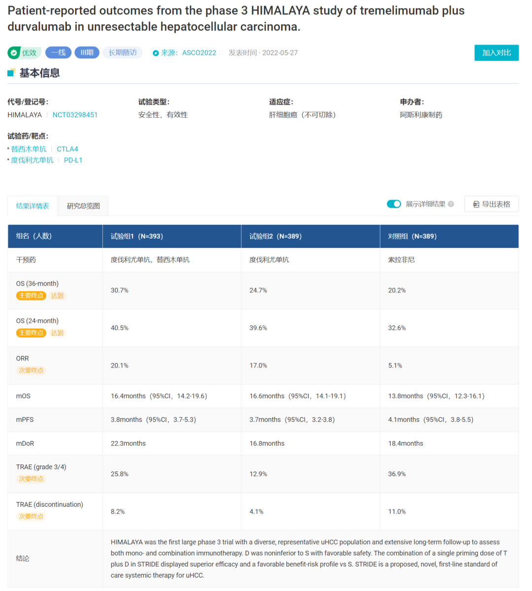 在 2022 ASCO GI 中,阿斯利康公布了 HIMALAYA 研究的最终数据。相较于索拉非尼组,接受 STRIDE 方案治疗的患者死亡风险降低了 22%(HR = 0.78;96.02%[CI]:0.65-0.93,p = 0.0035)。联合疗法组中位 OS 为 16.4 个月,而索拉非尼组为 13.8 个月。据估计,31% 接受联合疗法的患者在 3 年后仍然存活,而索拉非尼组这一数值为 20%。