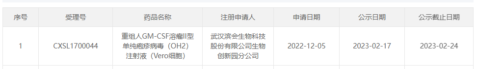2023年2月27日/医麦客新闻 eMedClub News/--日前,据国家药品监督管理局药品审评中心(CDE)官网公示,武汉滨会生物科技股份有限公司生物创新园分公司(以下简称“滨会生物”)的溶瘤病毒产品:“重组人GM-CSF溶瘤II型单纯疱疹病毒(OH2)注射液(Vero细胞)”被正式纳入突破性治疗品种(受理号:CXSL1700044)。