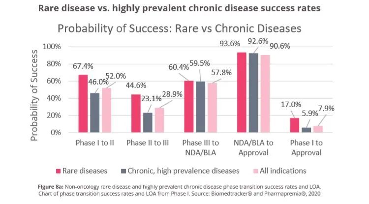 研究发现,针对罕见病开发新药的成功率比其它疾病更高。根据BIO、Informa Pharma Intelligence和QLS于2021年联合发布的一项报告:在2011年~2020年,罕见病(不含肿瘤适应症)药物从1期临床到获得FDA批准上市的平均成功率为17.0%,高于整体药物的平均开发成功率7.9%。而其中的罕见肿瘤适应症药物从1期临床到获得FDA批准的平均成功率(6.8%)也高于非罕见肿瘤适应症(4.4%)。