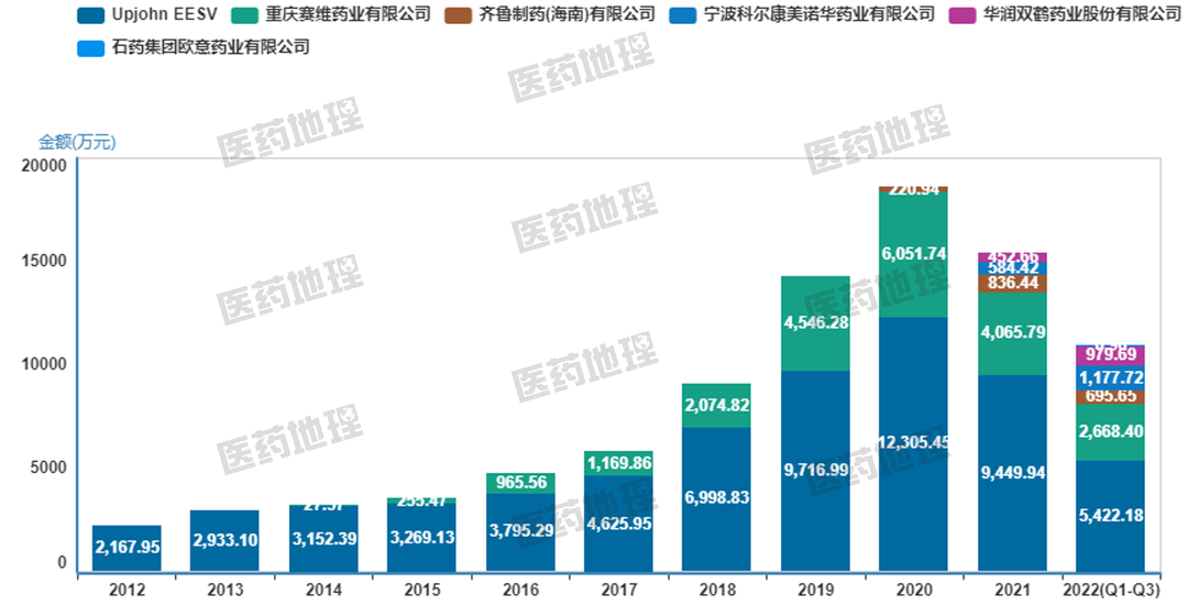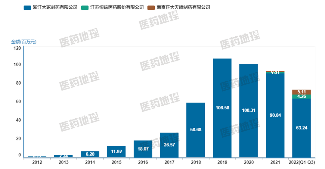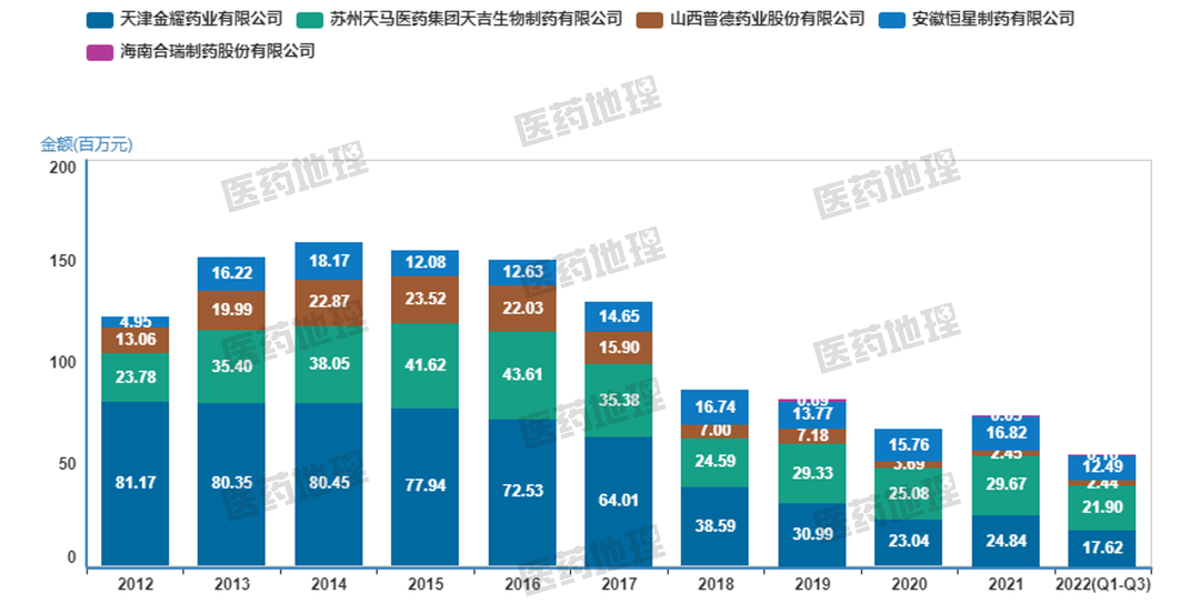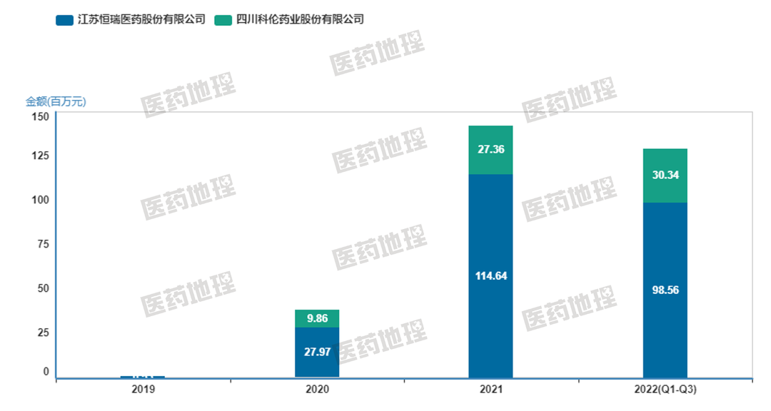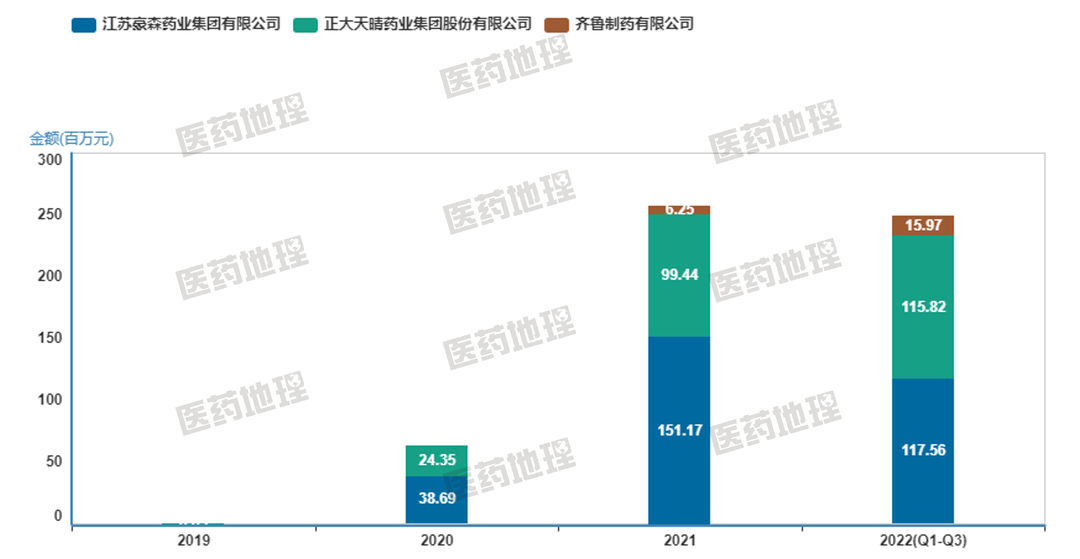 注射用福沙匹坦双葡甲胺,医保支付标准为136元(150mg/瓶),江苏豪森作为最早申报的企业,目前市占率较高,2020年至2022年Q3,销售额分别为3869万、1.51亿元和1.17亿元,正大天晴、齐鲁制药和罗欣药业(2022.5.31获批)也已布局该药。