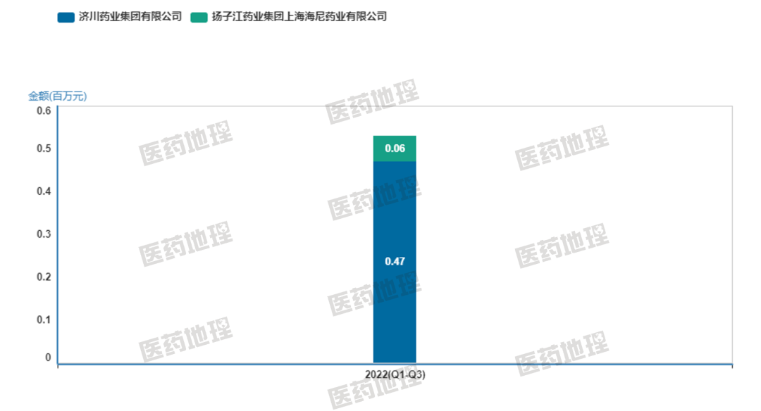 硫酸镁钠钾口服用浓溶液,医保支付标准为48元(177ml/瓶),目前市面上仅有扬子江药业集团(2022.3.1获批)和济川药业(2022.1.30获批)两家企业,由于上市不久,销售额并不大,仅为46.98万元和6.18万元。