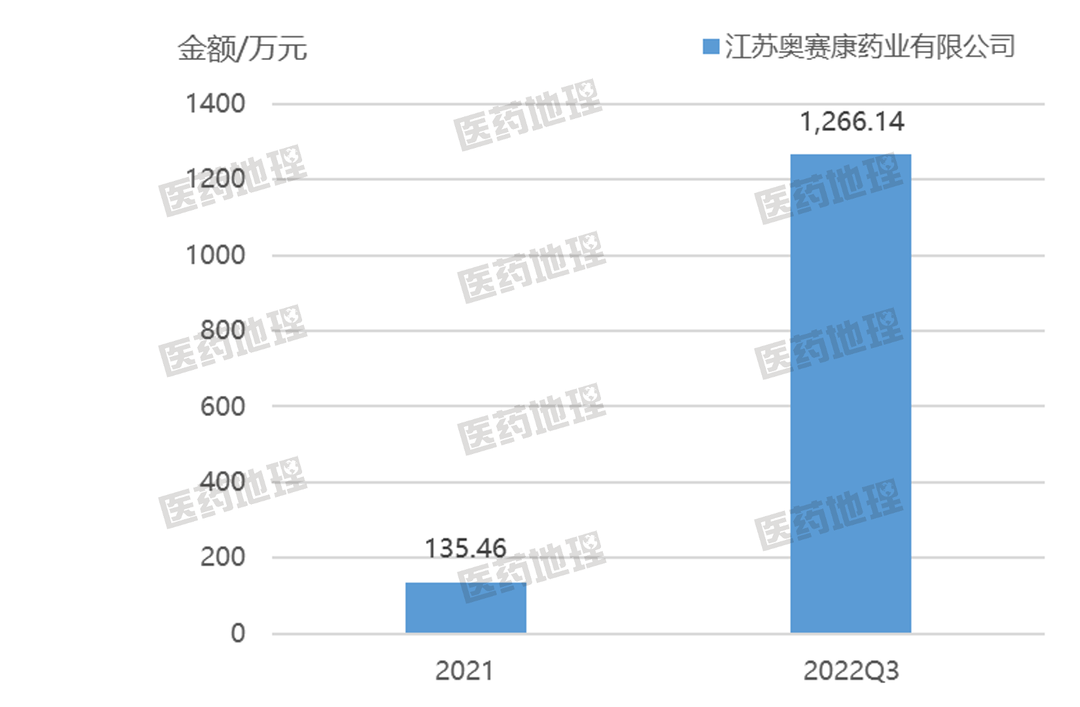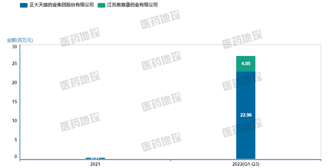 泊沙康唑注射液,医保支付标准为748.5元(16.7ml:0.3g),目前江苏奥赛康药业有限公司(2021.4.27获批)一枝独秀,2022年前三个季度销售额为1266.14万元。