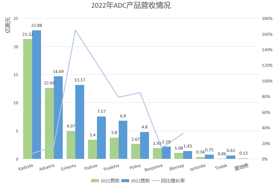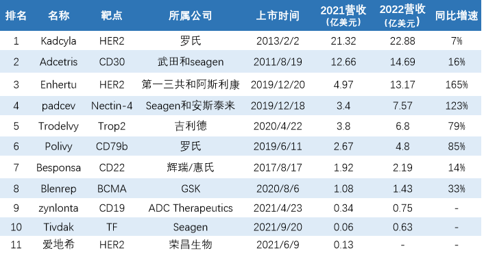 Enhertu虽然仍然位居第三,但是与Adcetris的差距极速缩小,2022年营收13.17亿美元,同比增长165%。