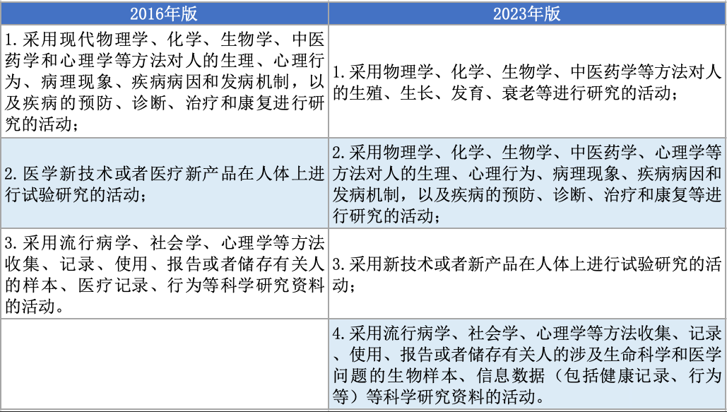 涉及人的生物医学研究生命科学和医学研究,是指以研究参与者的生物样本、信息数据(包括健康记录、行为等)开展的研究活动。相比2016年版,伦理审查覆盖范围有所扩大(见下图)。