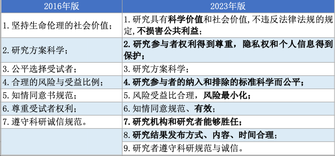 涉及人的生命科学和医学研究应当具有科学价值和社会价值,需要遵循国家相关法律法规和国际公认的伦理准则,不损害公共利益,这部分的主要变化有:
