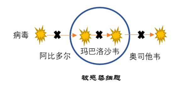 奥司他韦属于神经氨酸酶抑制剂,通过抑制流感病毒神经氨酸酶的活性,把子代病毒封锁在感染细胞内,阻止其继续扩散至其他人体细胞;阿比多尔属于血凝素抑制剂,通过抑制流感病毒血凝素的活性,阻止病毒进入人体细胞内,还可以诱导干扰素生成,发挥广谱抗病毒作用;玛巴洛沙韦属于RNA聚合酶抑制剂,可直接抑制流感病毒RNA的合成。