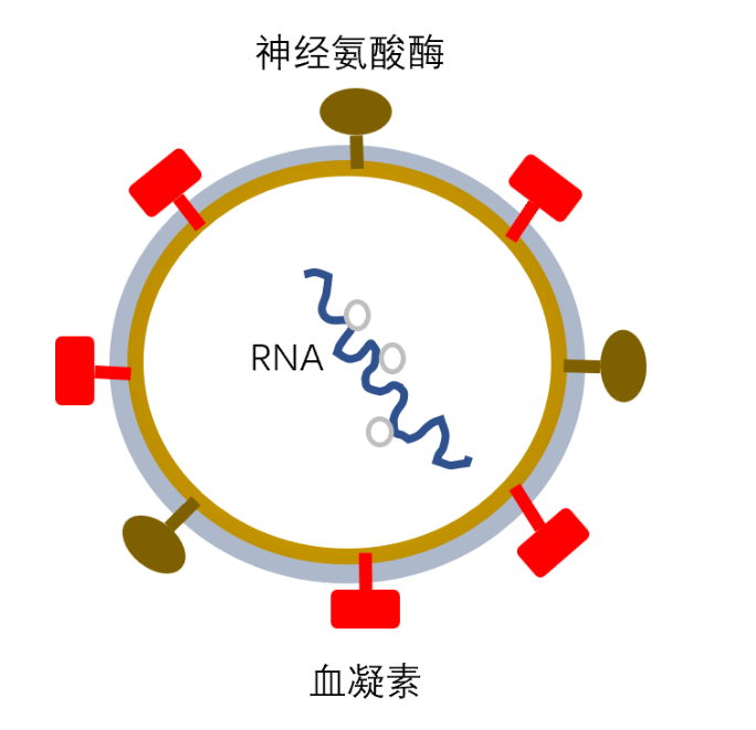 流感病毒有两只手,一只手叫“血凝素”,另一只手叫“神经氨酸酶”,呼吸道上皮细胞,首先通过细胞膜上的唾液酸抓住血凝素,使病毒进入细胞内,然后再通过唾液酸把子代病毒封锁在细胞内,阻止其继续扩散。流感病毒为了逃出细胞,必须使用神经氨酸酶,除掉唾液酸。