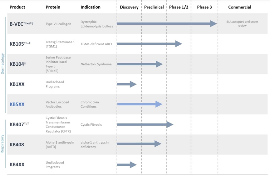 2018年,美国FDA授予KB103用于营养不良性大疱性表皮松解症(DEB)治疗的快速通道认定。