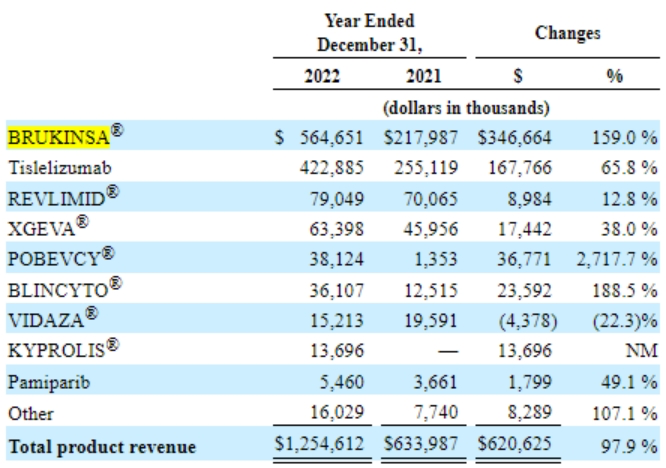 百济神州是特别的那一个。2022年,其总收入也来到百亿关口,约合96亿元。产品收入12.55亿美元,同比增长97.9%。百济的商业化归结起来,就是“集中资源在国内撕开了口子,强势攻城略地获得了领导地位;在海外,凭借临床优势以及适应证优势,迅速抢占了新患者市场。”