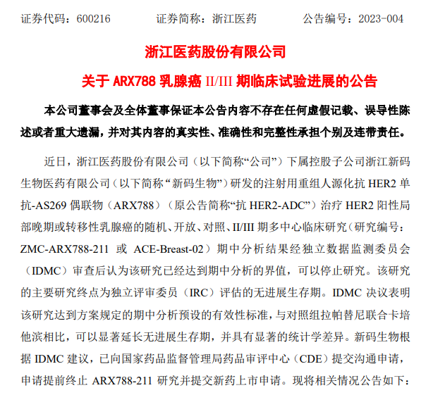 3 月 2 日,浙江医药宣布,旗下新码生物的 HER2 ADC 药物 ARX788 用于治疗 HER2 阳性局部晚期或转移性乳腺癌的随机、开放、对照、II/III 期多中心临床研究期中分析已达到预设的有效性标准,可以停止研究。