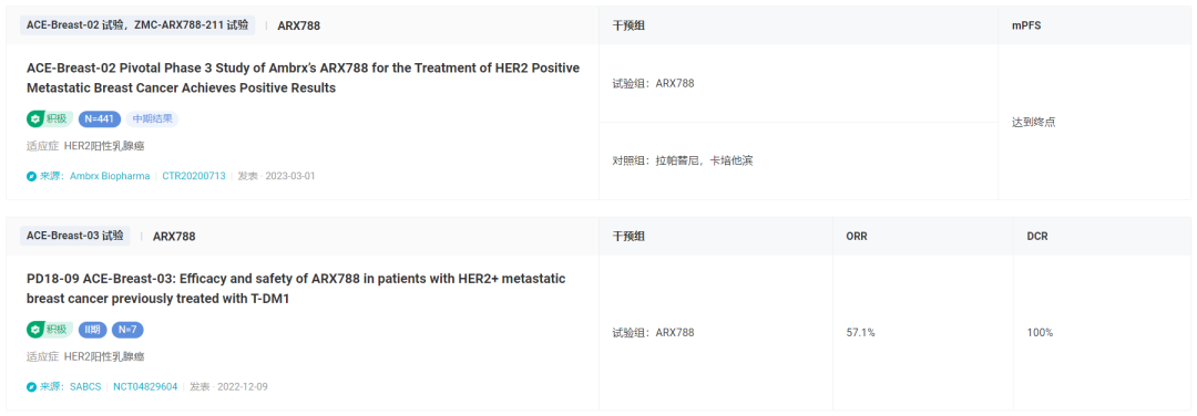据 Insight 数据库显示,ARX788 在 2017 年 10 月首次公示启动临床,而本次达到终点的 II/III 期临床试验 ACE-Breast-02(登记号:CTR20201708,其他代号:ZMC-ARX788-211)在 2020 年 8 月登记,在复旦大学附属肿瘤医院等 86 家中心同时开展,国内入组 440 人。