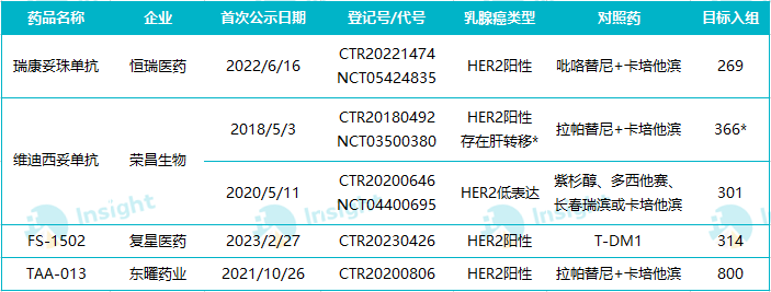 单独来看乳腺癌适应症,瑞康妥珠单抗、维迪西妥单抗和 FS-1502 都同时有 HER2 阳性和低转移乳腺癌布局,TAA-013 则暂未开展针对 HER2 低表达的研究。