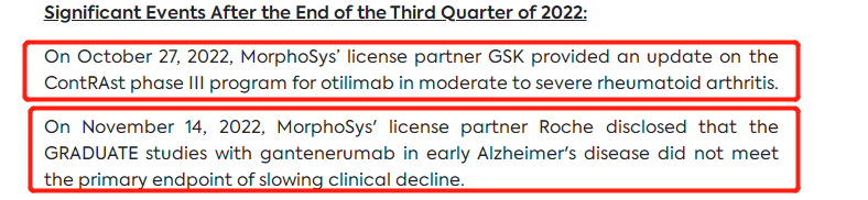 而另外一个值得关注的问题可能,是MorphoSys AG的现金流赛道,从第三季度财报来看,该公司的目前现金和其他金融资产为10.381亿欧元,而去年仅仅前三季度事实上已经产生了4.805亿欧元的净亏损,远大于2021年的1.335亿欧元。如果按照2022年的消耗速度,恐怕只用一年MorphoSys AG的现金流赛道就将枯竭。而根据第三季度财报MorphoSys AG自己的陈述,2022年里程碑不会带来任何显著的现金增值收入,这使得第四季度的预测可能向着更糟糕的方向踩下油门。
