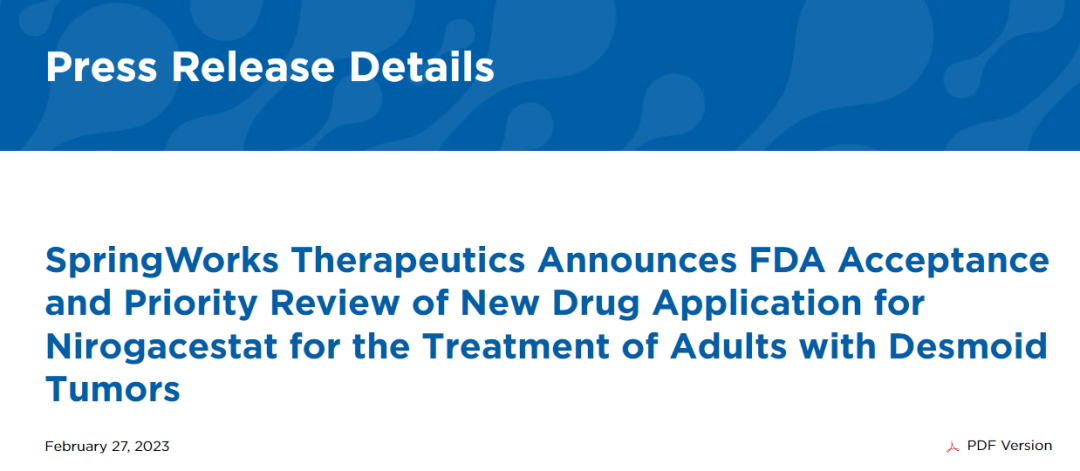 2月27日,SpringWorks Therapeutics公司宣布,FDA接受其口服特异性γ-分泌酶小分子抑制剂nirogacestat的新药申请(NDA),nirogacestat是一种在研伽马分泌酶生物制药公司,用以治疗硬纤维瘤(desmoid tumors)成人患者。同时,FDA授予此申请优先审评资格,并预计于2023年8月27日前完成审查。