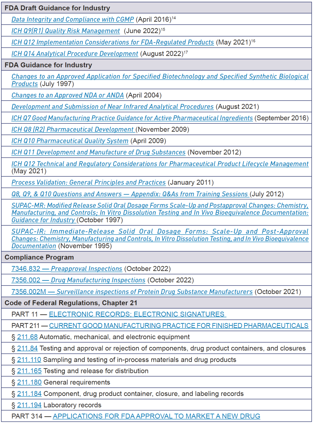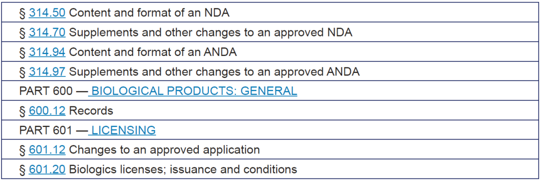 21 CFR 11, 211.68, 211.180, 314.70, 314.97, 601.12
