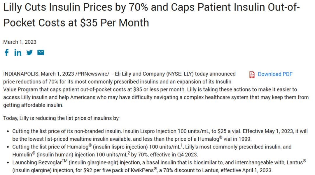 3月1日,礼来宣布其胰岛素类药品在美国全线降价。其中,畅销全球的胰岛素品牌Humalog(赖脯胰岛素)和Humulin(重组人胰岛素)降价70%,于2023年第四季度生效;非品牌赖脯胰岛素注射液(100 U/mL)的价格将会降至25美元/瓶的历史最低,甚至低于1999年Humalog的价格;可互换甘精胰岛素生物类似药Rezvoglar(insulin glargine-aglr,5支/包)的价格为92美元,仅为赛诺菲Lantus的78%,于2023年4月1日生效。礼来同时宣布将患者每月的自付费用限制在35美元或以下,立即生效。