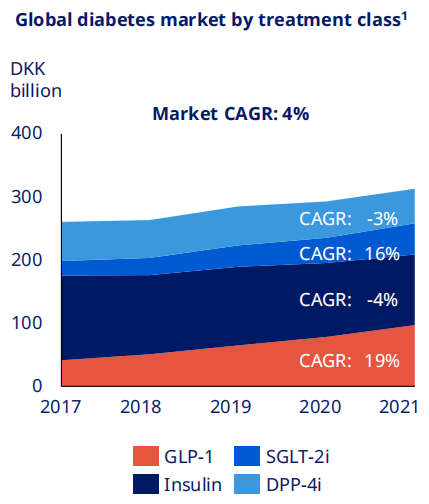 诺和诺德是糖尿病领域的霸主。从2022年财报可以看出,其糖尿病业务总收入达到197.71亿美元,占到公司总收入的79%。从收入构成上看,虽然胰岛素的收入逐年下降,但仍占到了糖尿病业务的38%,地位举足轻重。