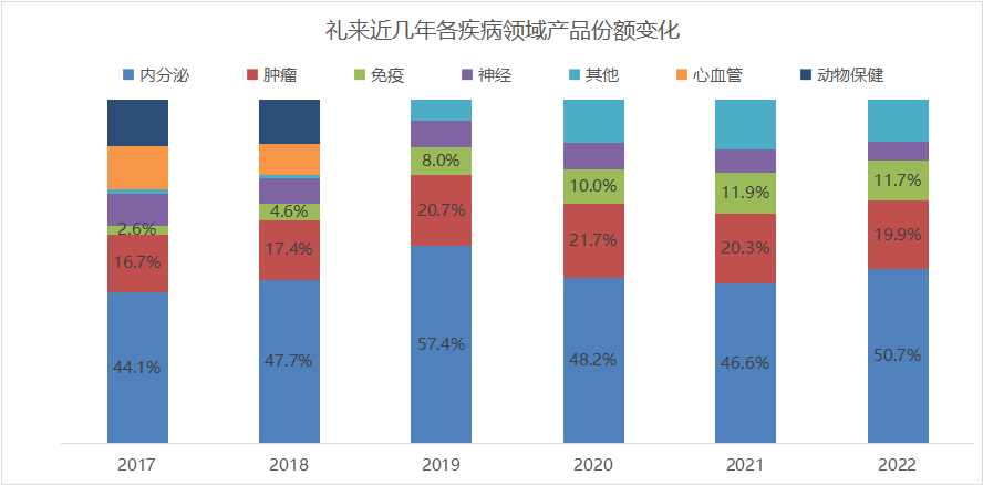 2022年,其重磅长效胰岛素Lantus和另两款胰岛素产品合计销售收入35.91亿美元,与这家制药巨头427.97亿美元年收入体量相比,胰岛素的地位也就没有那么重要了。因此,旁观礼来和诺和诺德的举动或许是赛诺菲的策略。反观礼来的历年收入构成,糖尿病产品虽然一直是重要收入来源,2022年仍占据半壁江山,但是肿瘤和免疫业务的贡献也逐年提高,占比从2017年的19.3%快速增加至31.6%。